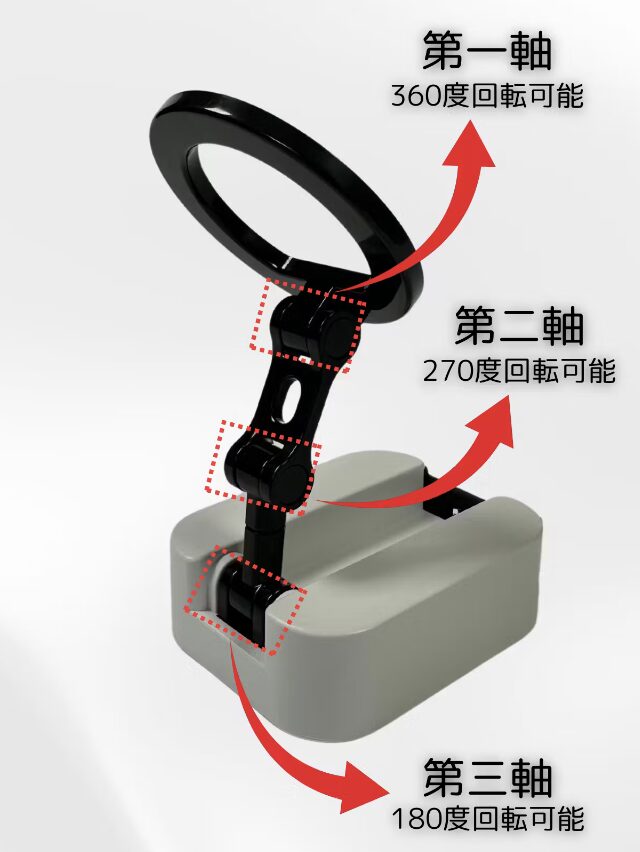 MagPosiは、三軸設計+360度回転可能で、好きな角度にスマホを調整できる多機能スタンド。