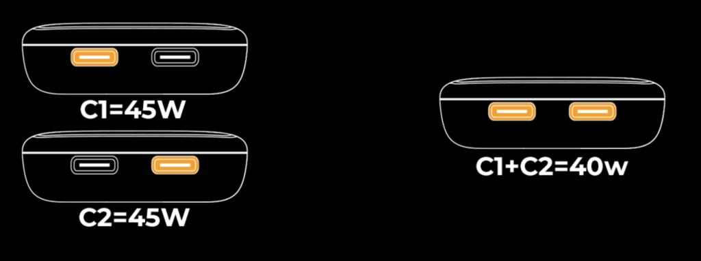 単ポート使用時は最大45W出力、2ポート同時使用でも合計約40Wを確保。