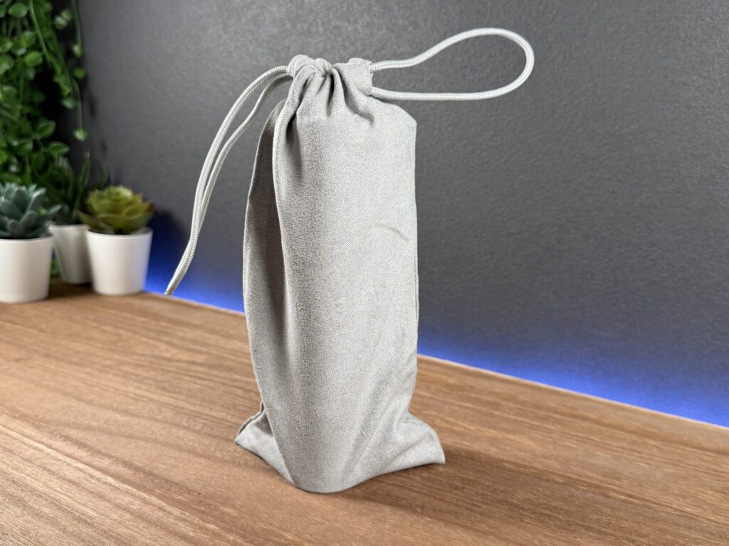 キャリングバッグは薄くSHARGEのロゴが入ったグレーの巾着袋。ケーブル類との持ち運びに便利です。