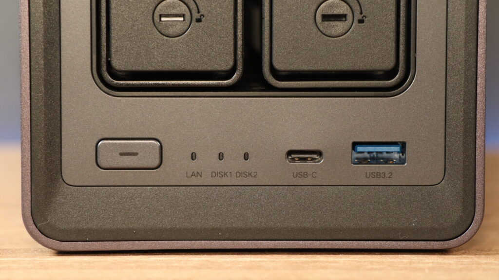 前面:電源ボタン、インジケーター、USB-C、USB-A (どちらも10Gb/s)