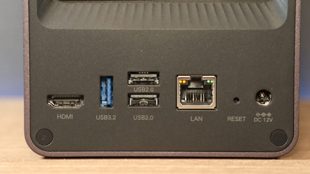 背面:USB3.2-A (5Gb/s)、USB2.0-A (480Mb/s)×2、HDMI(4K)、LANポート(2.5GbE)、DC 12V、RESETボタン
