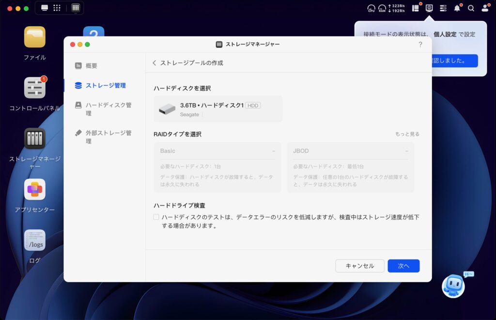 今回僕は4TBのHDDを1つしか挿入していないのでRAIDの設定はできませんが、必要な方は設定をしてみてください!