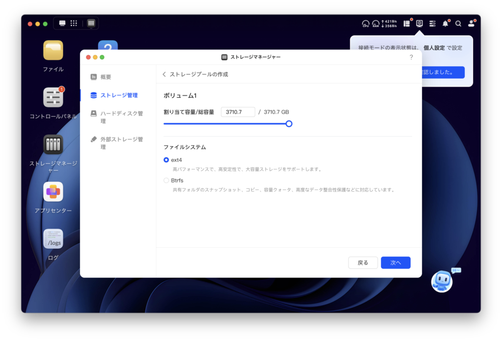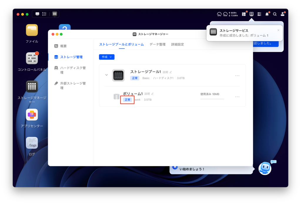 ストレージ管理画面からボリュームを割り当ててext4のファイルシステムを選択します。