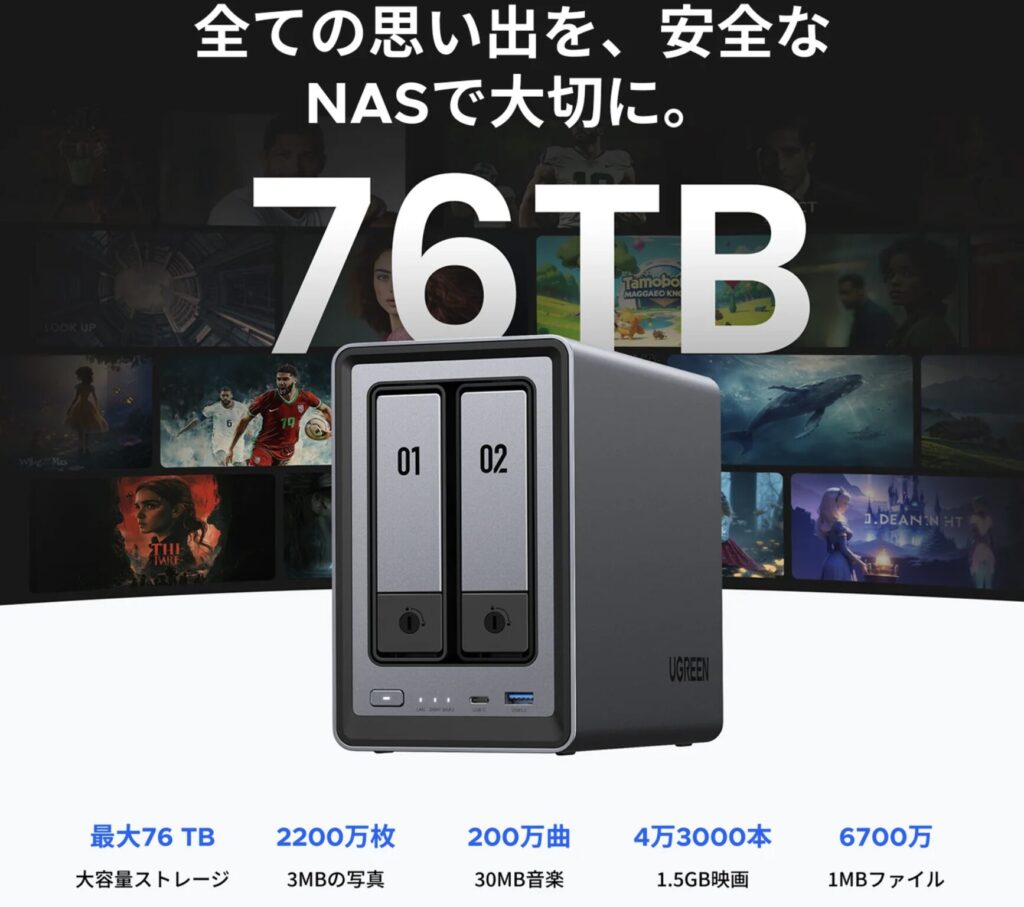 UGREEN NASync DXP2800は、最大76TBまでの大容量ストレージに対応しており、写真や動画、各種データをまとめて管理できます。