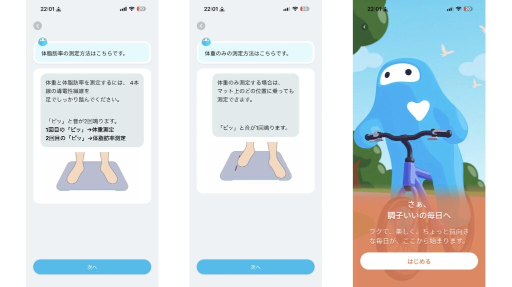 ・設定が完了すると、体重、体組成の測定方法を教えてくれます!