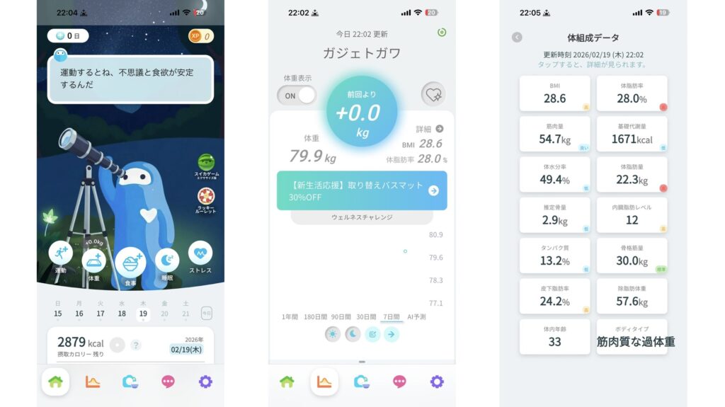そして画像左がホーム画面、中央が体重管理画面、右が体組成データになります!