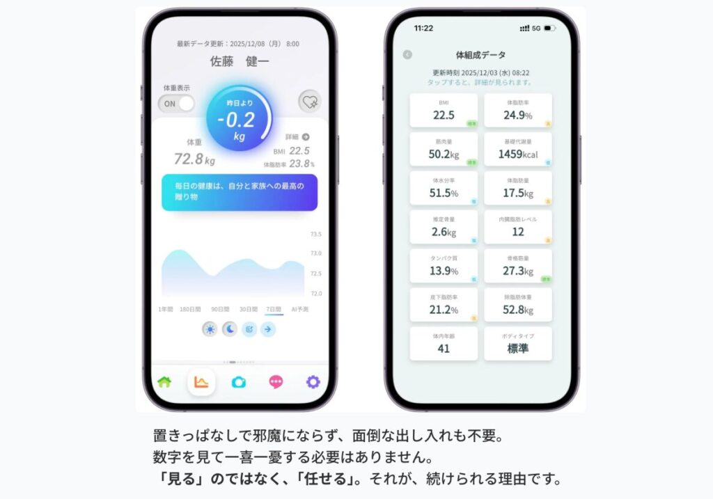 お風呂上がりに“ただ乗るだけ”で体組成が自動記録されるという体験は、想像以上にストレスフリーです。